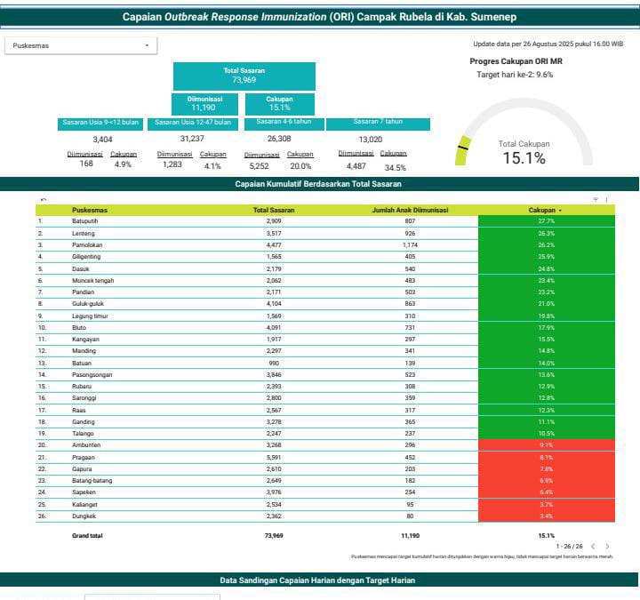 Berdasarkan data Dinkes Sumenep, hingga saat ini tercatat 2.035 kasus positif campak dengan 17 orang meninggal dunia. Angka tersebut menunjukkan pentingnya percepatan cakupan imunisasi agar wabah tidak semakin meluas.