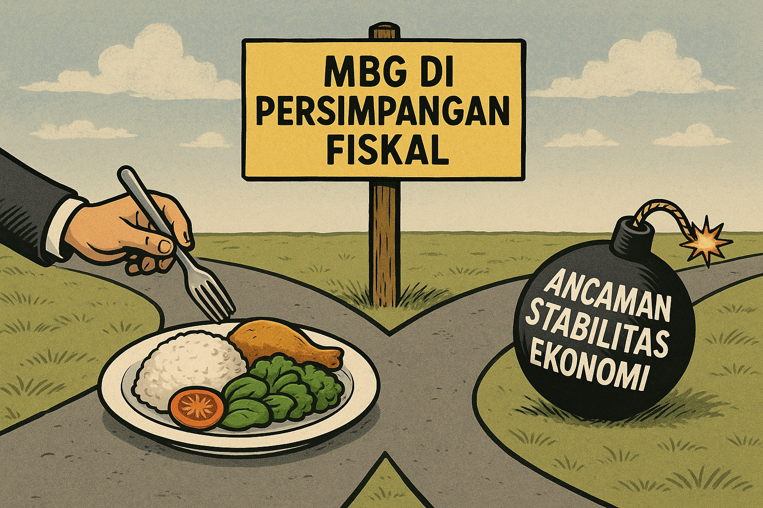 Bayangkan sejenak jika ekonomi Indonesia adalah sebuah kapal besar yang tengah berlayar di laut bergelora, maka Program Makan Bergizi Gratis (MBG) ibarat badai yang datang dengan janji hujan kesuburan sekaligus ancaman angin topan. Tahun 2025, pemerintah menggelontorkan dana fantastis sebesar Rp71 triliun untuk program ini, sebuah investasi untuk memperbaiki gizi masyarakat sekaligus menghidupkan denyut nadi ekonomi. Namun, di tengah lautan yang sedang tak menentu, rasio penerimaan negara hanya sebesar 11,9% terhadap PDB dan proyeksi defisit anggaran yang membengkak hingga 2,8% menurut OECD (2025). Gambaran dari secercah data tersebut menyeruak hingga memunculkan suatu pertanyaan menggantung seperti awan gelap: Apakah MBG ini suluh harapan yang menyinari masa depan, atau justru akan menjadi bom waktu fiskal yang mengguncang stabilitas ekonomi nasional?